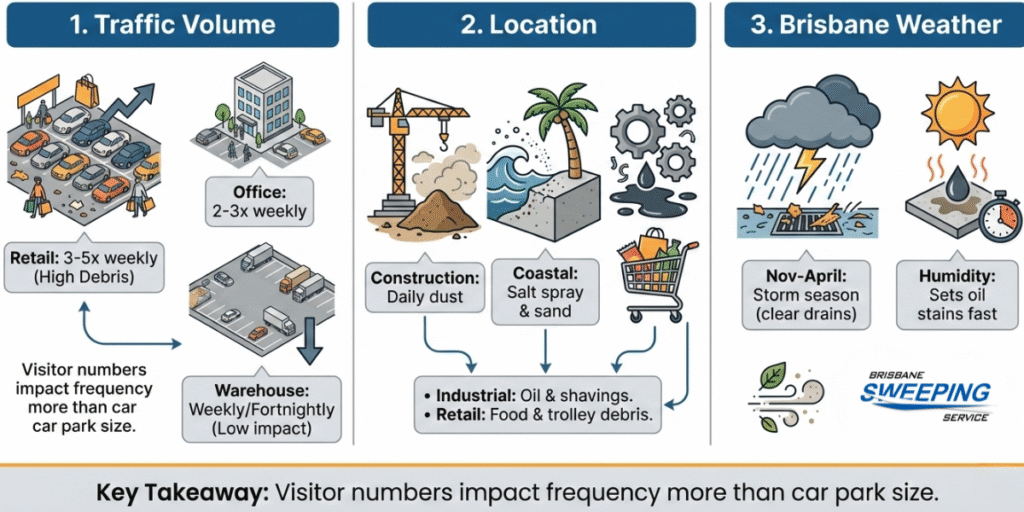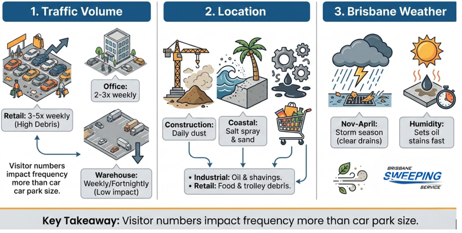 Typically, it comes down to three things: how busy your car park gets, where it’s located, and what Brisbane’s weather throws at it. And understanding these means you’ll stop second-guessing your cleaning frequency.